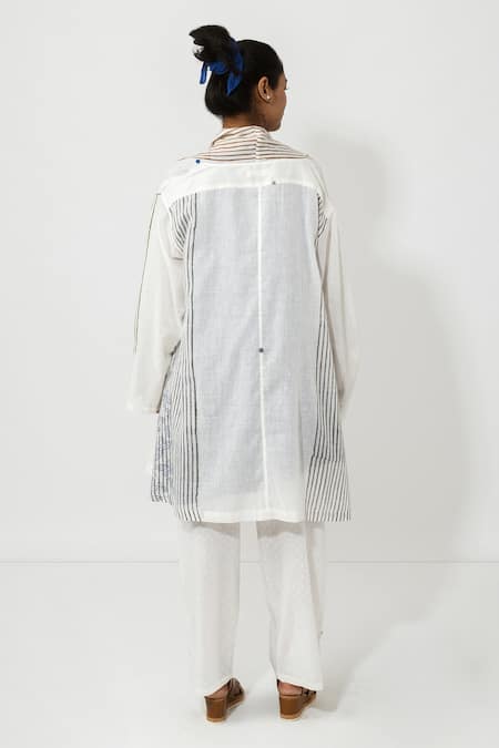 White Cotton Floral Print, Stripes And Thread Round Jacket Kurta Set