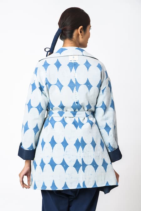 Blue hand block printed reversible jacket featuring a flap collar and full sleeves. Comes with a matching belt for added style.