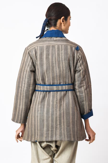 Grey cotton quilted jacket featuring all over hand block print and side pockets. Comes with a coordinating belt for added style.