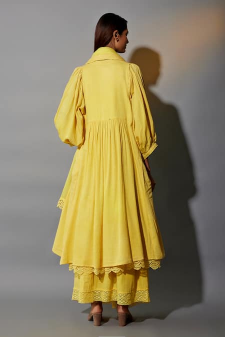 Yellow natural dyed cotton blend overlay with puff sleeves and scalloped cut work crochet lace work border. Paired with a brown flared anarkali featuring all-over Moroccan hand block print, contrast color block panels, and a solid yellow skirt along with a dupatta and tie-up belt.