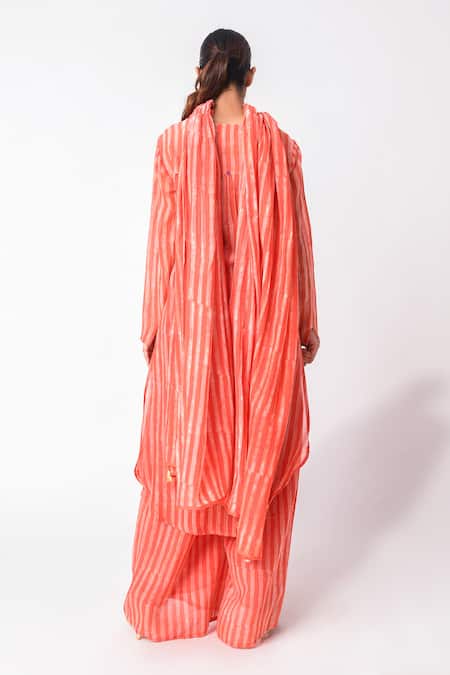 Orange Chanderi silk kurta featuring hand block printed linear pattern. Paired with matching pant and dupatta.