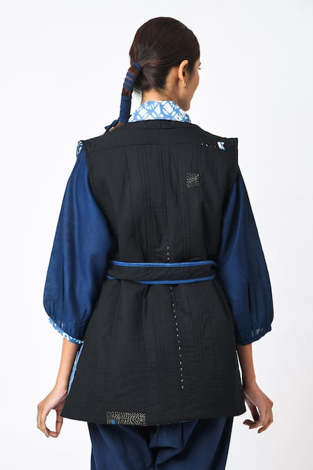 Black cotton quilted jacket featuring a shawl collar and sleeveless design. Comes with a quilted belt and block printed inside lining with handwork details in golden thread.