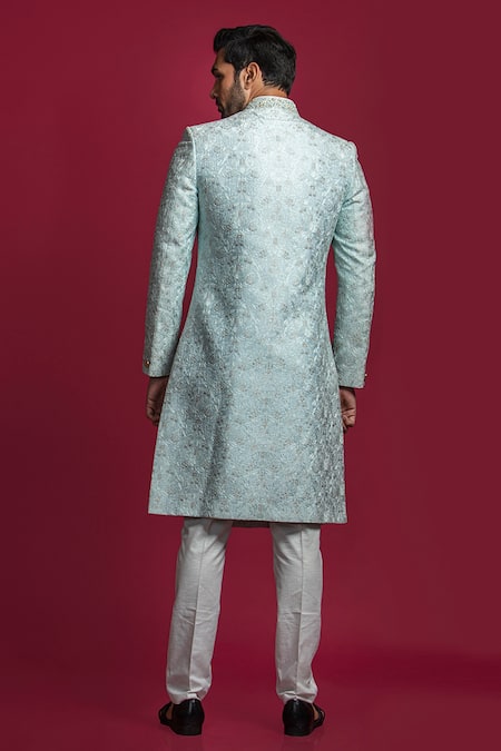 Sky blue sherwani featuring Lucknowi floral and thread embroidery with a mandarin collar and full sleeves. Paired with a kurta and pant.