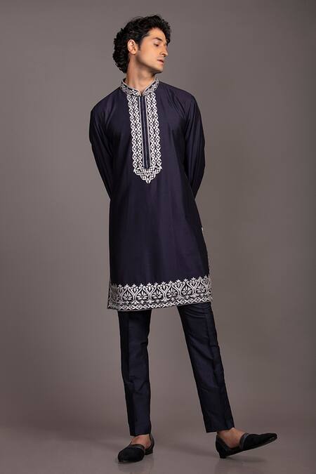 Navy blue kurta featuring a mandarin collar and full sleeves with silver foil print. Paired with matching pant, the kurta showcases embroidered borders for added elegance.