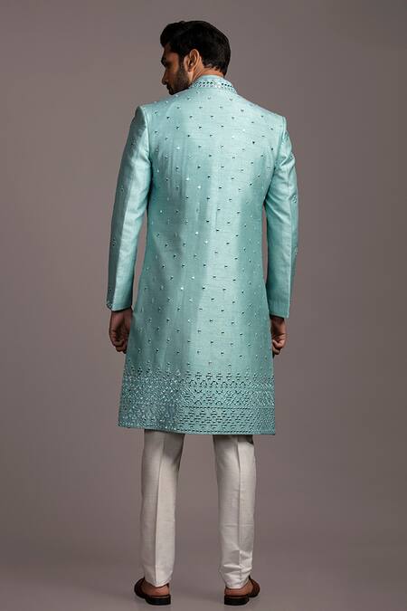Sky blue A-line sherwani featuring mirror embroidery and a mandarin collar. Paired with a coordinating kurta and pant made from spun silk and tussar dupion silk.