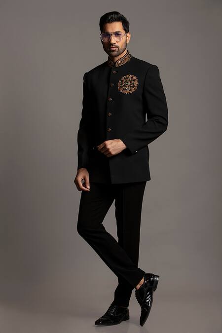 Black jodhpuri featuring thread placement embroidered flower, welt pocket & flap pocket. Paired with matching pant with side pockets.