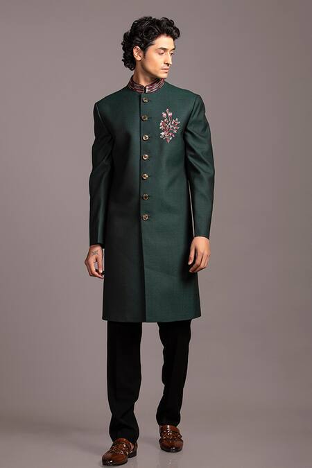 Bottle green sherwani featuring floral placement embroidery and a mandarin collar. Paired with matching pants for a complete look.