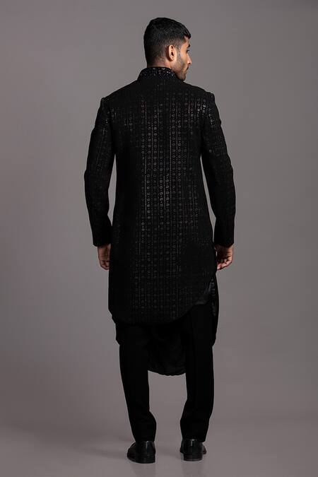 Black sherwani featuring geometric embroidery with sequins and an asymmetric hemline. Paired with a matching pant and a draped kurta.