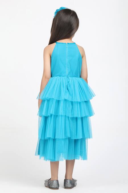 Blue silk gown featuring pearl embellished neckline and layered detailing. The gown comes with a matching hairband for a complete look.