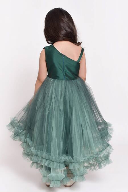 Green one shoulder gown featuring a 3D floral embellished yoke and ruffled hemline