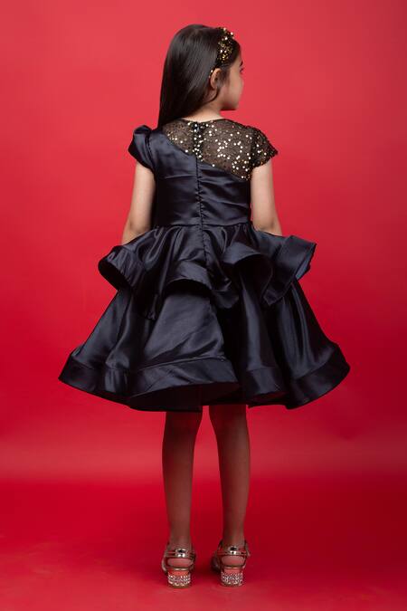 Gold toned sequin embellishments on the bodice, Layered ruffle detailing at the hem