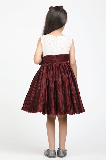 Brown net dress featuring sequin embroidered wave motifs and a ruched bow pattern. Comes with a matching hairband.