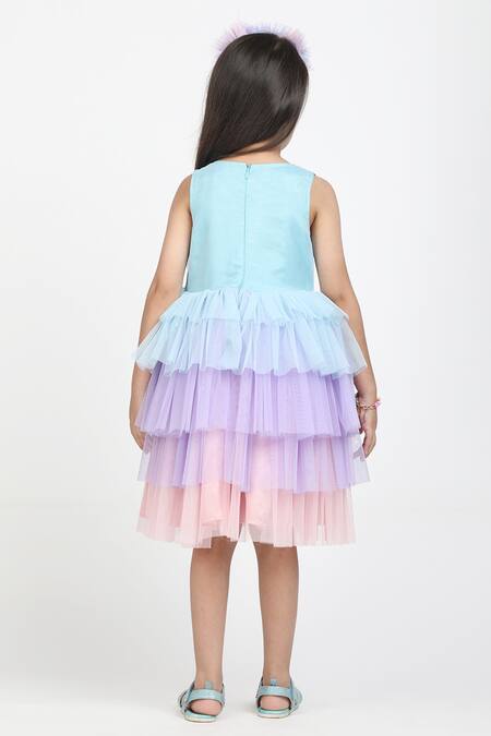 Layered frill pattern with varying colors, Sequin embroidered motifs on bodice, Back zipper closure for easy wear