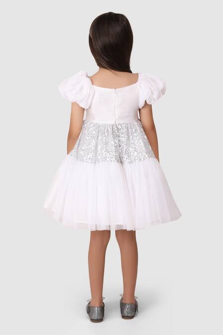 White woven net dress featuring a silk bodice with sequin work embroidery