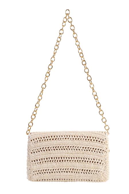 Off white clutch featuring a woven textured base with a shell emblem embellishment. Includes a convertible chain sling handle and a single compartment for storage.