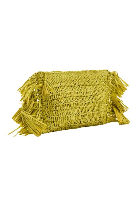 Green woven clutch featuring a textured base and side fringed tassels