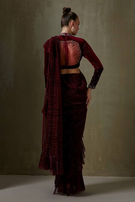 Wine pre-draped saree in shimmer pleated base & ruffle hem. Comes with velvet blouse with jewelled high neck and a petticoat.