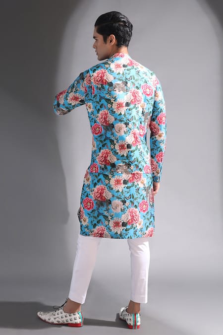 A sky blue silk kurta featuring an all-over floral print, a band neckline, full sleeves with buttoned cuffs, and side slits. It is paired with a white cotton straight pyjama with side pockets.