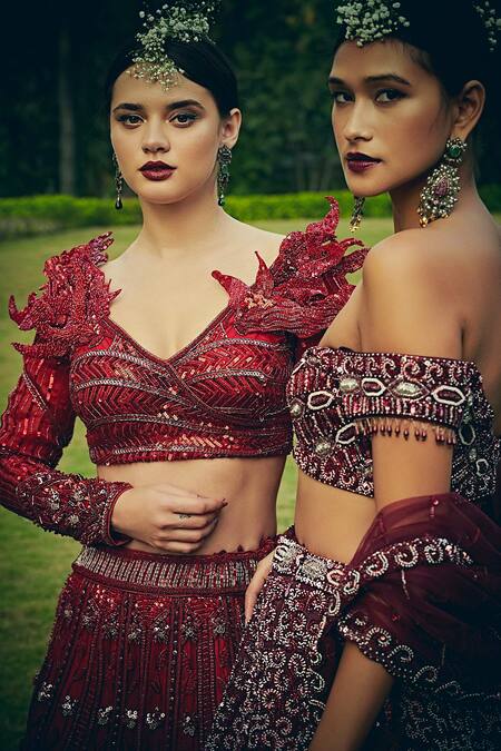 Urban red lehenga with brick red glass bugle beads all-over with 3D floral motifs. Paired with full sleeves blouse with appliqued shoulder.