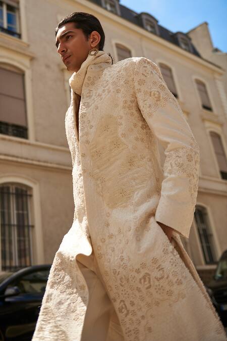 White Silk, Velvet, Chanderi Silk, Linen, Embroidered Blossom Sherwani Pant Set