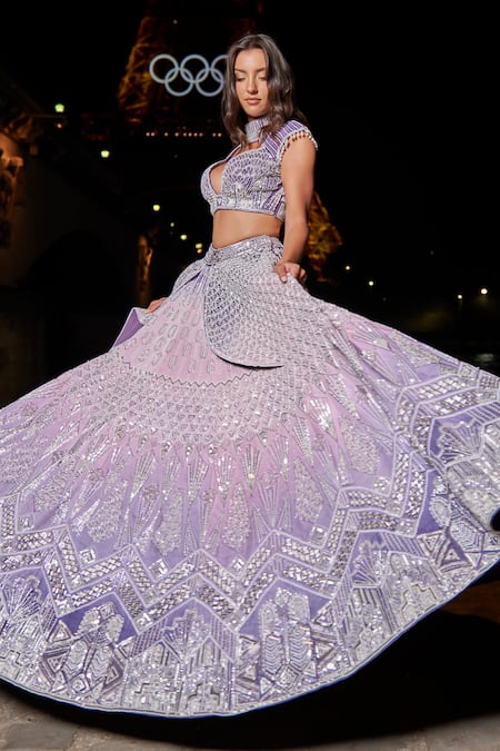 Purple lehenga featuring embroidered geometric motifs embellished with sequins, beads, and crystals. Paired with a padded cut-out blouse with an attached lining.