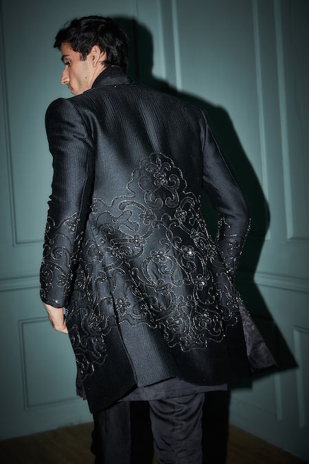 Black jacket featuring embossed fabric with intricate cutdana and salli embroidery at the hem. Paired with a longline shirt and matching trousers crafted from linen satin.