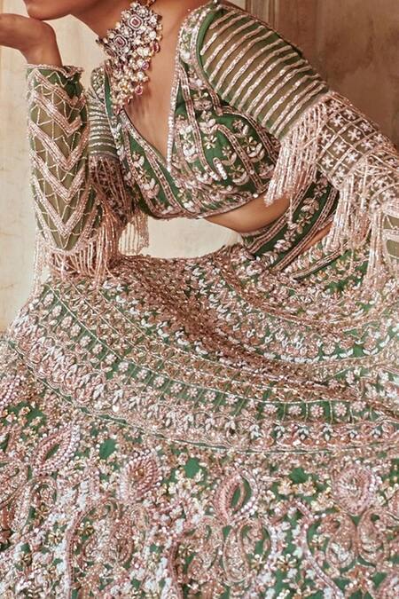 Emerald green pure raw silk lehenga with attached cancan and all-over paisley embroidery. Comes with embroidered blouse with cups & embroidered dupatta.