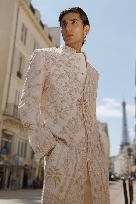 Ivory sherwani featuring zardozi embroidered floral vine motifs with bead and sequin embellishments. Paired with a matching kurta, pant, and linen satin dupatta.
