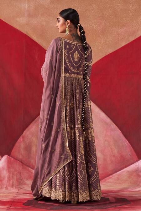 Dull purple jacket anarkali featuring golden dori, aari, sequin & bead hand work all over. Paired with a pant and an embroidered organza dupatta.