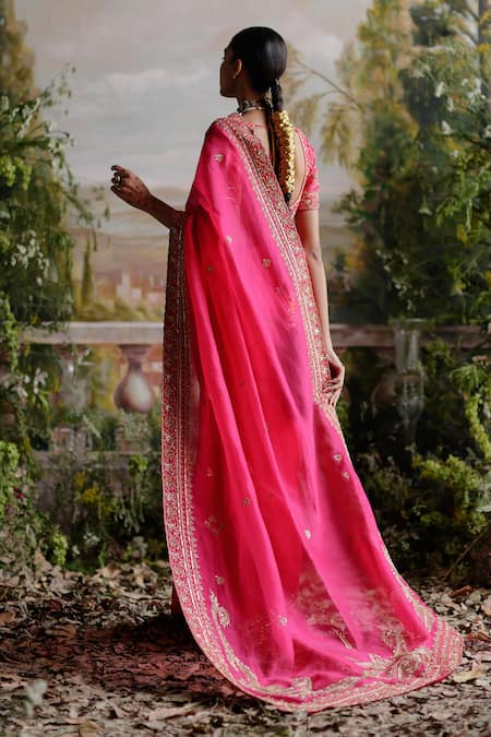 Pink saree featuring intricate antique gold dori, sequin, bead, and cutdana embroidery in a floral pattern. Paired with a half sleeve padded blouse and a scallop border with a back tassel tie-up.
