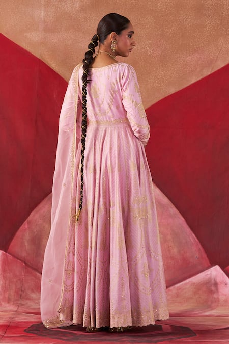 Baby pink jacket anarkali featuring golden dori & aari embellished hand embroidery. Paired with a pant and an embroidered hem sheer dupatta.