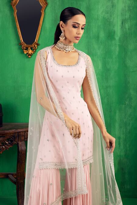 Blush pink kurta featuring silver aari and sequin floral embroidery. Paired with a pleated gharara and sheer embroidered dupatta.