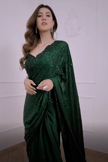Emerald green saree with sequin embroidered motifs. Paired with blouse.