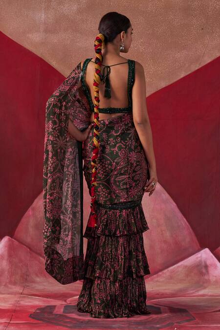 Multicolor pre-drape saree with floral print and ruffle detailing. Paired with a bead and sequin embroidered blouse featuring a plunge back.