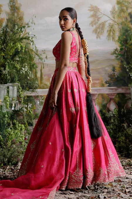 Pink Silk, Organza Sequins, Beads V-neck Leaf Embroidered Bridal Lehenga Set
