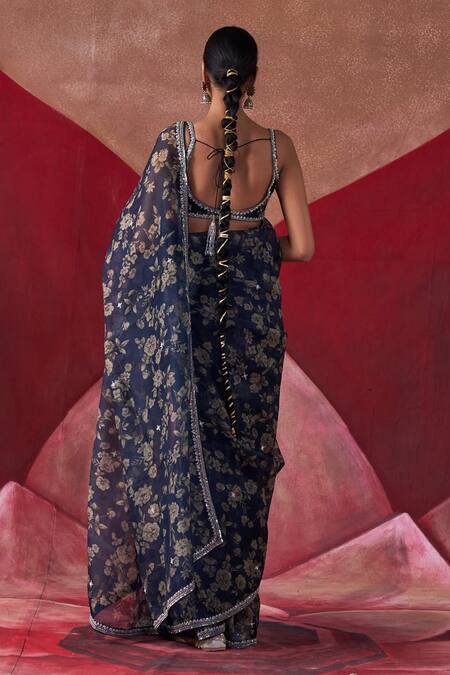 Indigo blue organza saree featuring a hand embroidered rose pattern with silver sequins, beads, and pearls along the hem. Paired with a coordinating blouse that has a plunge back and tassel tie-up detail.
