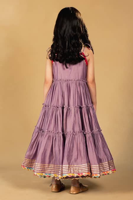 Purple dress in Chanderi fabric featuring tiered, gathered detailing and a square neckline