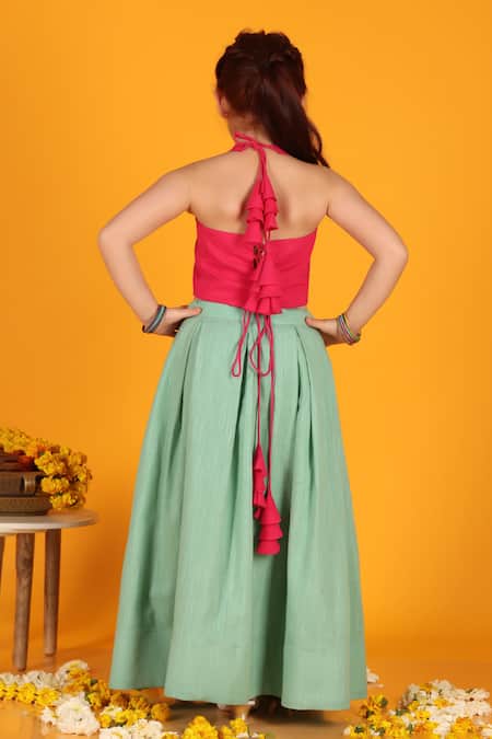 Green cotton lehenga featuring box pleated detailing. Paired with a pink blouse adorned with bird patchwork embroidery.