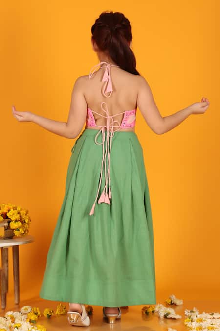 Green lehenga featuring box pleated detailing and a side tie-up with tassels. Paired with a pink blouse adorned with mirror border embroidery and a halter neck design.