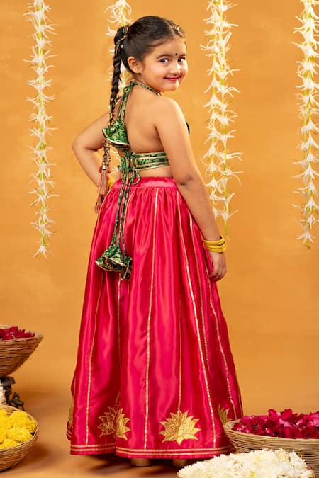 Green and pink lehenga set featuring a Banarasi brocade blouse with a drawstring closure. The lehenga is adorned with gold motifs and a flowing silhouette.