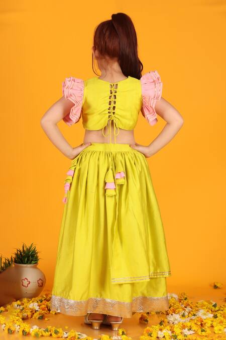Yellow Silk Tassels, Gota Patti, Lotus Placement Lehenga And Blouse Set