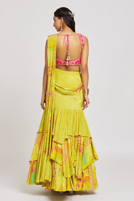 Pink V-neck padded blouse featuring mirror and lotus gardenia embroidery. Paired with a yellow lehenga saree showcasing hexagon print and layered detailing.