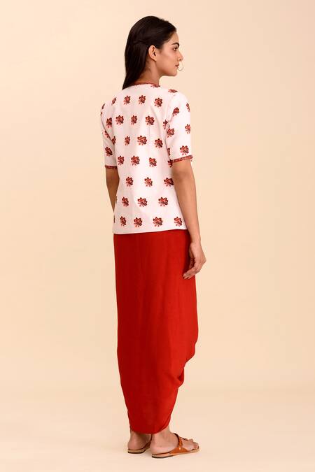 Red Rayon Slub Floral Motifs Round Jiya Draped Skirt Set With Jacket