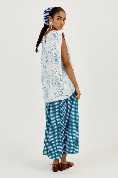 A white and blue hand-block printed top crafted in linen satin, featuring abstract floral patterns and hand embroidery details.