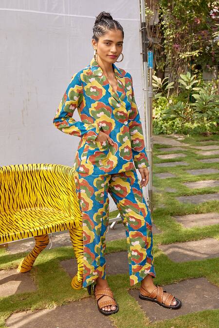 Blue blazer featuring a notched lapel collar, full sleeves, and vivid bloom hand block print. Paired with matching trousers designed with side pockets and front button detailing.
