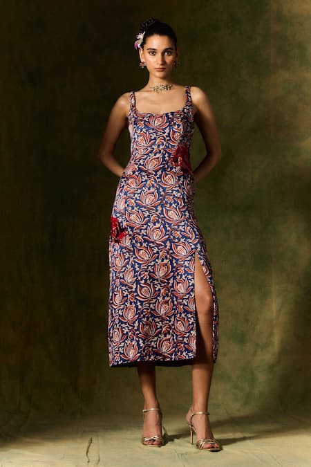 Blue floral handblock print dress featuring a U neck and back zip closure. Paired with a coordinating blazer with a lapel collar and full sleeves.