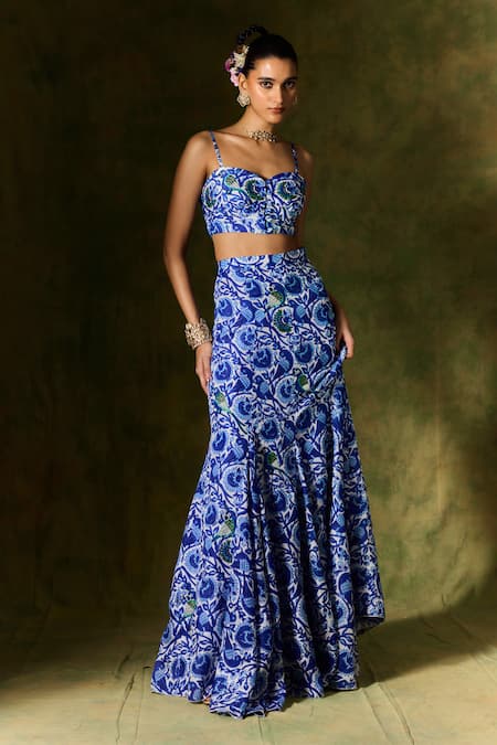 Blue floral and peacock handblock print skirt featuring sequin and bead hand embroidery. Paired with a coordinating sleeveless bralette with sweetheart neckline and front button closure.