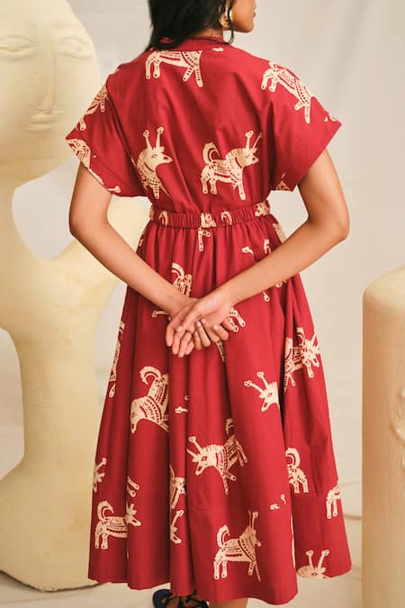 Red midi dress featuring a handblock printed animal design and a band collar neckline