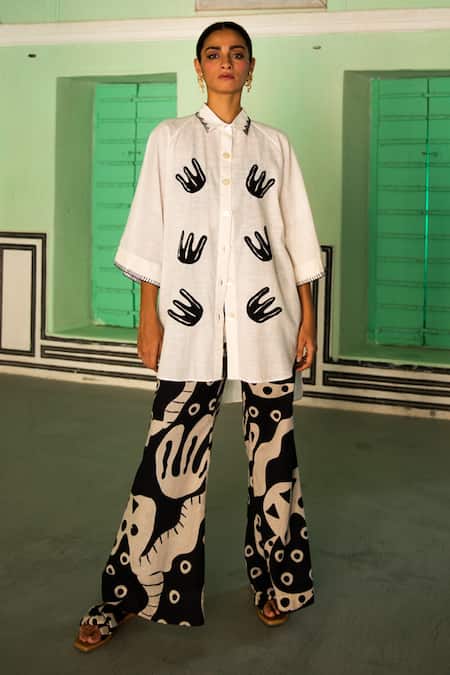 White shirt featuring a collared neck with black applique embroidery on the sleeves and collar