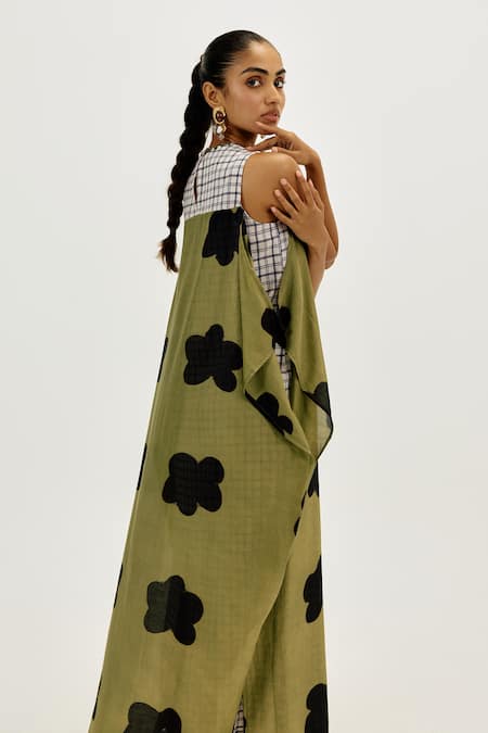 A green relaxed-fit maxi dress crafted in airy clamp-dyed Chanderi fabric, featuring a contrast full checkered lining and a back button closure.